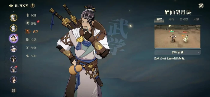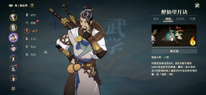 杯莫停:对锁定目标攻击4次,前三次每次造成100%外劲伤害,最后一击对目标及周围300范围内敌人造成300%外劲伤害,还附加5秒击倒效果。