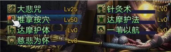 唐僧开局可选点“大悲咒”(11级左右最高升至25级),10级后学“推拿按穴”技能(未看到就再升几级),自动战斗才施放,其他技能同理,具体参考下图。