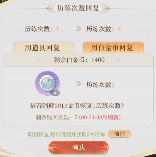 首先大家需要了解在游戏中,历练玩法总共分为5种类型的材料关卡,分别是铜钱历练、经验历练、风火历练、地水历练和阴阳历练,这5种材料关卡分别对应着不同的奖励和道具,是玩家获得铜钱、经验以及密探突破升级道具的关键副本,每种模块的历练次数每日为5次,但玩家可以通过使用道具来回复历练次数,每日最多可额外获得一次。