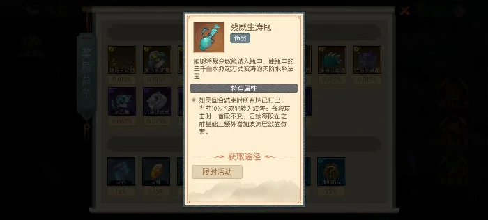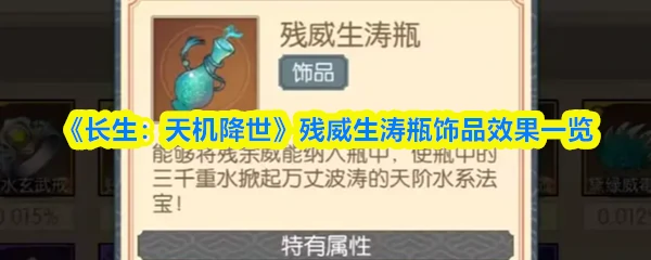 残威生涛瓶:天阶水系法宝,积蓄战斗残余威能,驱动瓶内三千重水发动强力多段攻击。