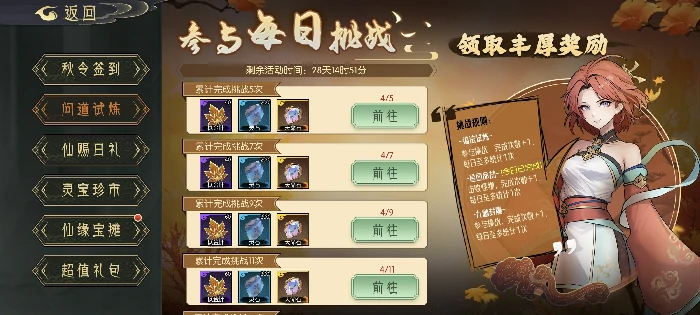 每日完成道法、命劫或九幽关卡各得1点进度,每日上限3点。活动期间需累计30点,10天全勤即可完成。注意:活动更新当日已通关的关卡,进度不会重复计入。