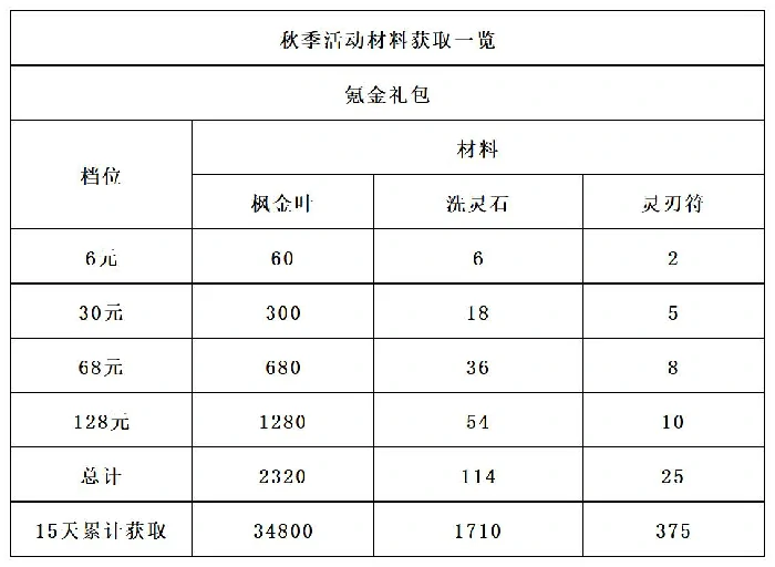 本次活动设有两类代币:枫金叶用于兑换奖励,灵刃符专用于砍价玩法,其余奖励以常规材料为主。