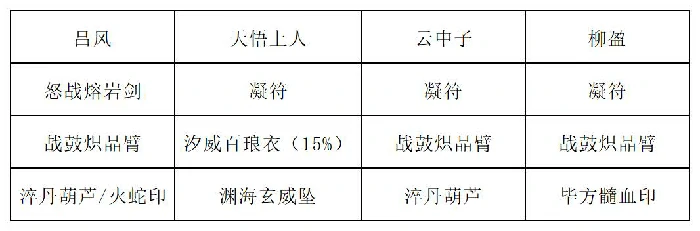 操作流程:一至五回合服战意丹,六回合换法力丹。一回合:云中子用百转叠浪诀、三清化水符、玄冰化刃符;吕风复制玄冰化刃符并使用;柳盈用玄冰神破、玄冰九变化及化刃符。二回合:柳盈继续玄冰神破、玄冰九变与化刃符;吕风复制化刃符并使用。三至五回合:柳盈打玄冰神破与玄冰九变,吕风复制一张玄冰九变并使用。若用装备2,五回合改:天悟上人打三清化水符、五行化水咒、断水龙威;柳盈用玄冰神破与玄冰九变;吕风复制所有玄冰九变并全打出。六回合:云中子用百转叠浪诀,吕风复制,天悟上人打三清化水符,云中子再打三清化水符,天悟上人接五行化水咒与断水龙威,吕风打复制的百转叠浪诀,柳盈用玄冰神破与玄冰九变,随后输出。