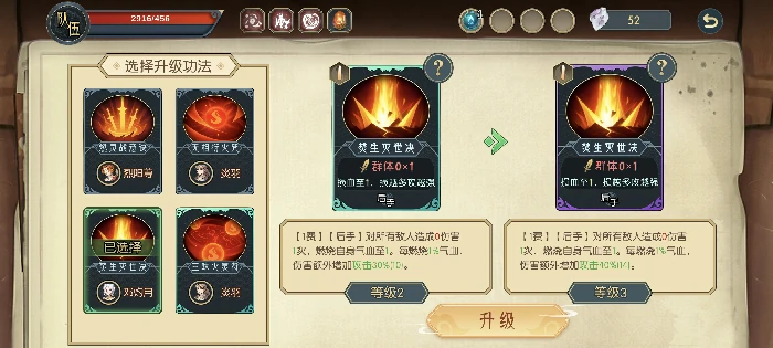 机制相似,选择后进入战斗,右上角可重新挑战刷新灵气组合。胜利获元晶奖励,功法关卡从四个随机功法中选一个升级,装备关卡从三件随机装备中选一件。