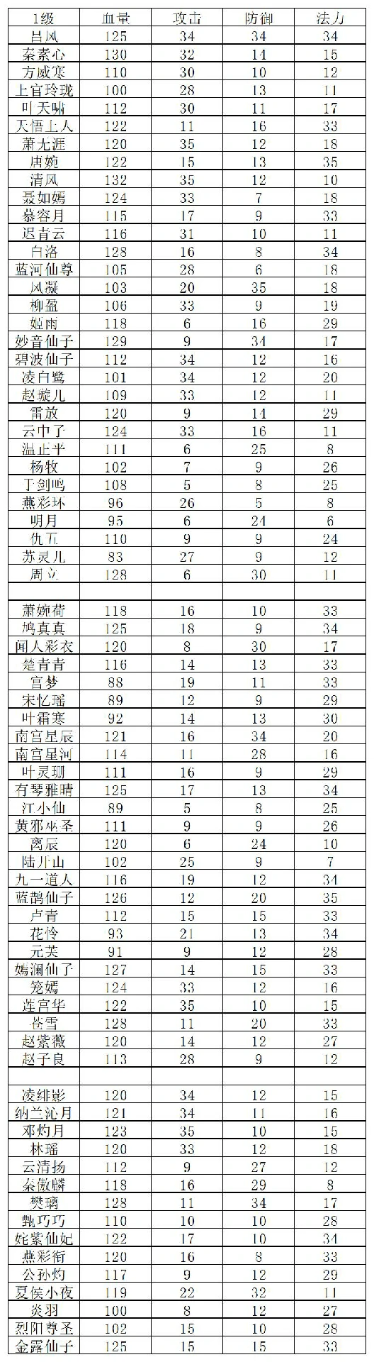 ③剩余气血:1点气血=1分,上限为队伍血量上限2倍。提升方式:选初始血量高角色并升羁绊等级(角色1级初始血量见下图);装备增加气血装备(最多8件,优先+75气血装备,可提升600点上限)。注:装备气血装仅提上限,不恢复血量,备好生元丹维持血线。