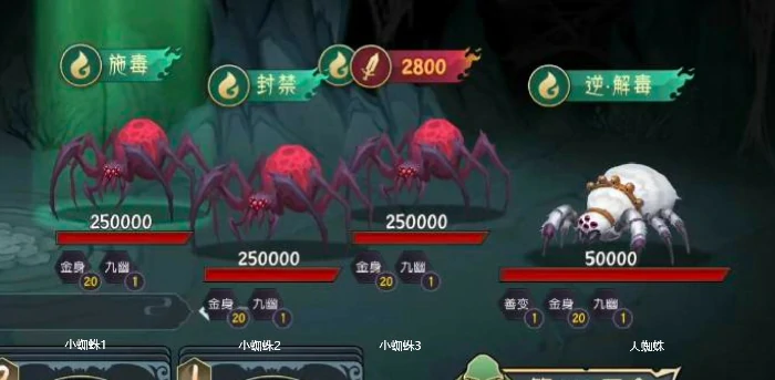 小蜘蛛1:1回合施毒2400,2回合封禁1角色,3回合超重击2800伤附虚弱,4 - 6回合循环。