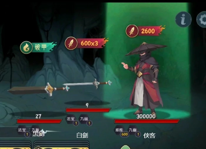特别提示:回合内无法通关,务必先攻击侠客再处理剑。剑血量极低,伤害计算值低,侠客血量极高,错误攻击剑将浪费大量伤害。
