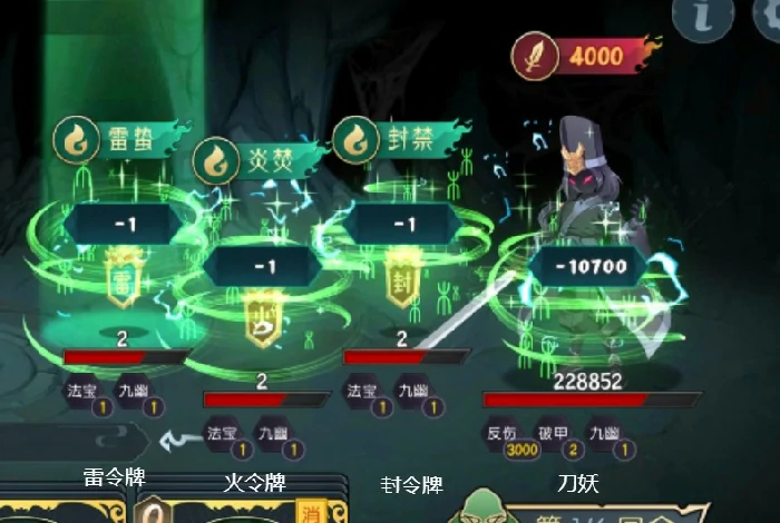 打法思路:精准控制伤害输出,避免多次触发反伤,配合雷灵珠与剑海丹完成令牌击杀,逐步压制刀妖血量。