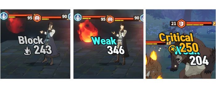属性克制伤害:根据攻击者与目标属性克制关系,对最终伤害加成或削减。我方有利、敌方不利时,显示蓝色WEAK提示,产生克制伤害。