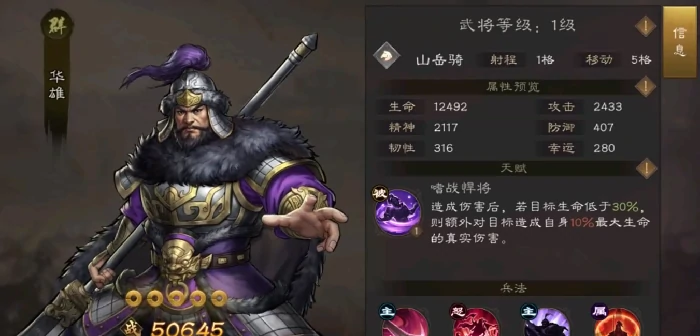 华雄:南华幻境核心武将,远程嘲讽机制驱动,强力输出型角色。历史败于关羽,游戏中可连斩潘凤等将。以下从天赋、技能、阵容、神兵星符多维度解析,助你发挥实战价值。