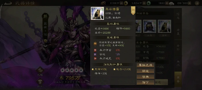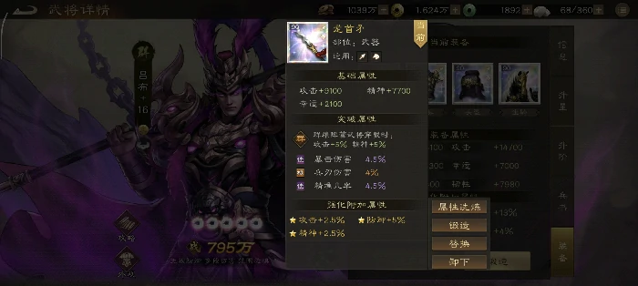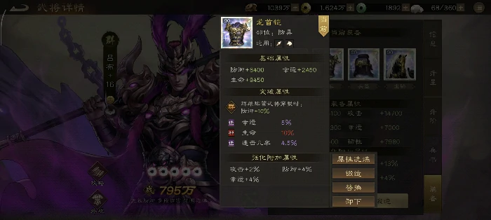 突破先升输出属性,防御装备往后放。以吕布为例: