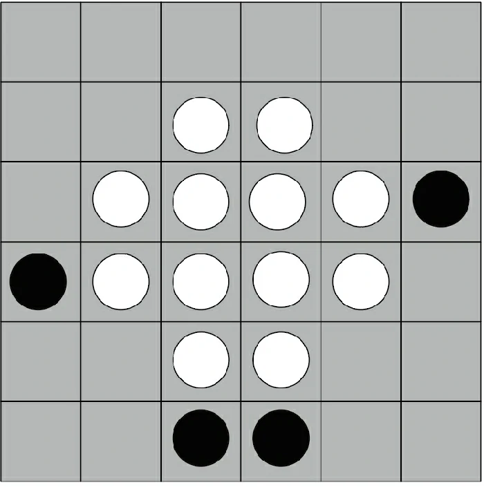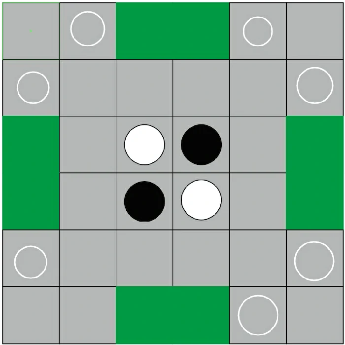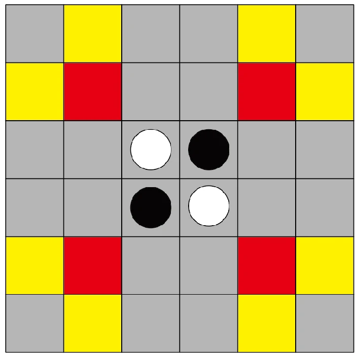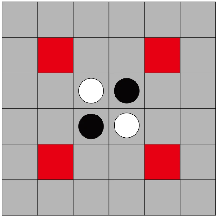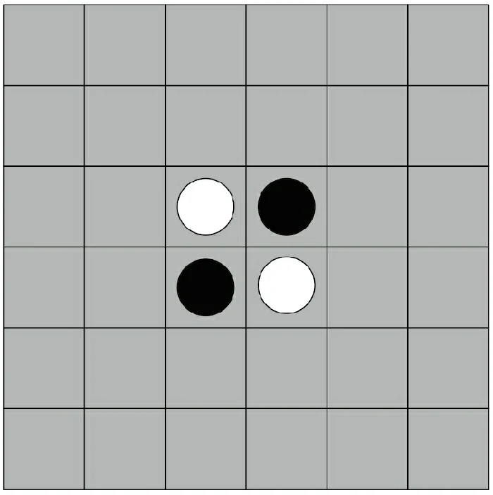 初始阶段,棋盘为6×6规格,黑白双方各两子,黑棋先行。