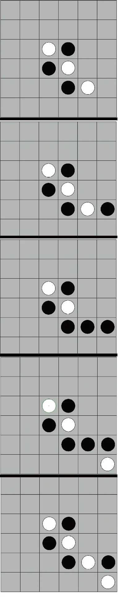 若出现我方占据绿色边线一点,对手四枚白子连成横或竖线的布局,果断落子完成四子翻转,此为极佳进攻机会。