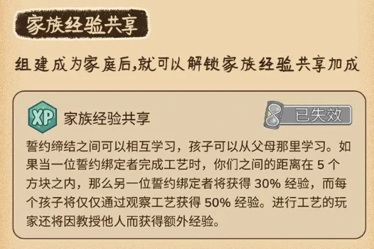 缔结誓约玩家间可相互学习,孩子能从父母处获取经验。誓约成员在5格范围内完成工艺制作,另一位成员得30%经验;孩子仅观察获50%经验。进行工艺制作的玩家因传授经验获额外奖励。
