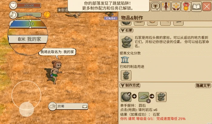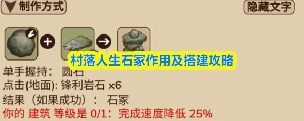 村落人生中,石冢助你野外定位,指引回家方向。角色稳定获取食物、熟悉操作后,即可建造石冢。需先解锁科技树石器时代I第四层。