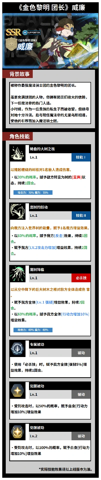 威廉,金色黎明魔法骑士团团长,下届魔法帝热门人选。身世成谜,凭实力与领导力获团员绝对信任。
