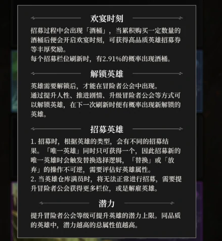 使用金币刷新酒馆英雄列表,每次刷新有机会遇到新伙伴,同时积累声望经验。通常刷新10 - 15次后等级提升(如从1级升至2级)。声望提高,高品质英雄招募概率永久增长。达到9级可招募SS品质英雄,之后每提升10级,进一步增加这类英雄潜力上限。