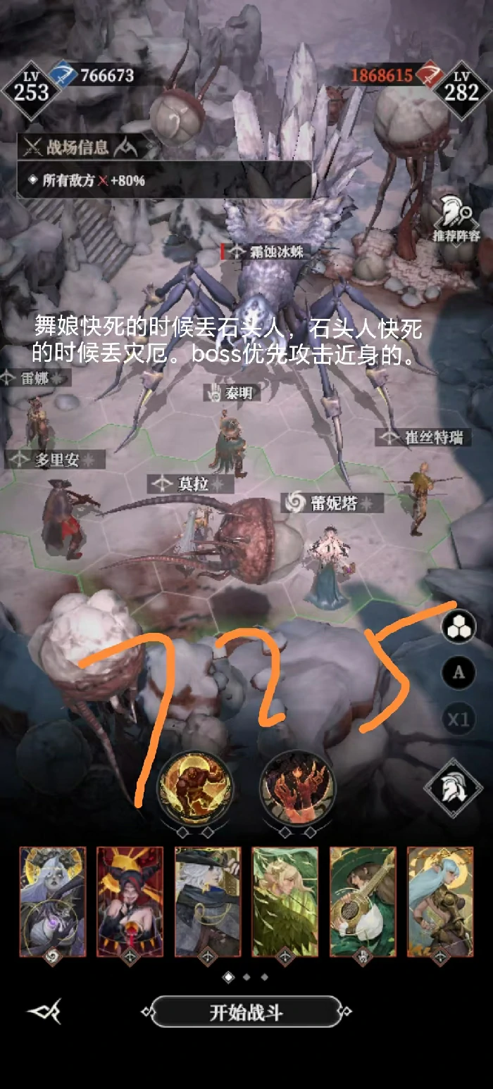 725层阵容思路:Boss优先攻击最近单位,舞娘濒死时释放美人技能,石头人濒死时释放灾厄技能。