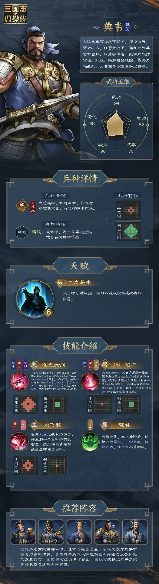 典韦定位T2对策武将,稀有卡存在感低,仅特定副本担当不可替代工具人,核心价值集中游侠系装备试炼,泛用性差,强度低于其他稀有角色。