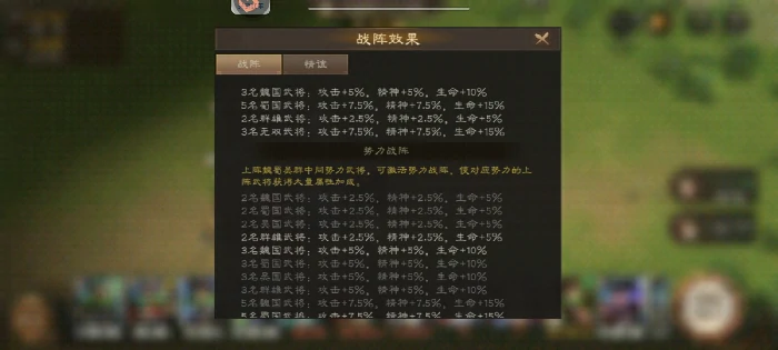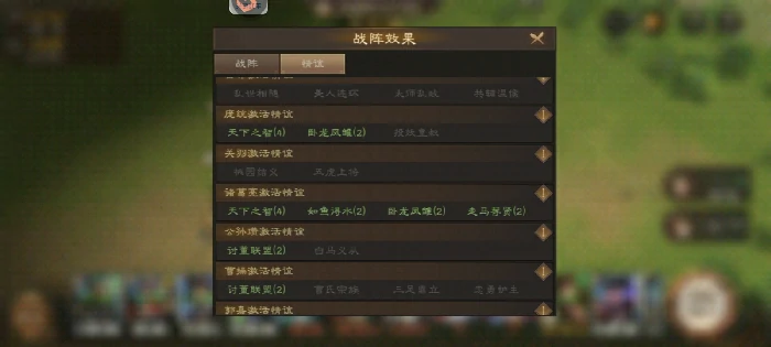激活加成:3无双增7.5%精神,5蜀国增7.5%精神;郭嘉+庞统+诸葛亮+荀彧触发天下之智提4%精神,刘备+诸葛亮激活如鱼得水加10%幸运,庞统+诸葛亮获5%增伤。