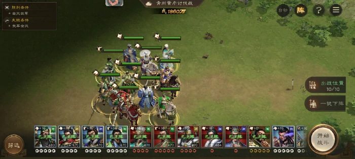 站位操作:诸葛亮放最上方,其余位置灵活调。曹操、公孙瓒先后放增益技能,诸葛亮进小树林区域放风系技能秒敌。金水符减敌方格挡,伤害已足够。
