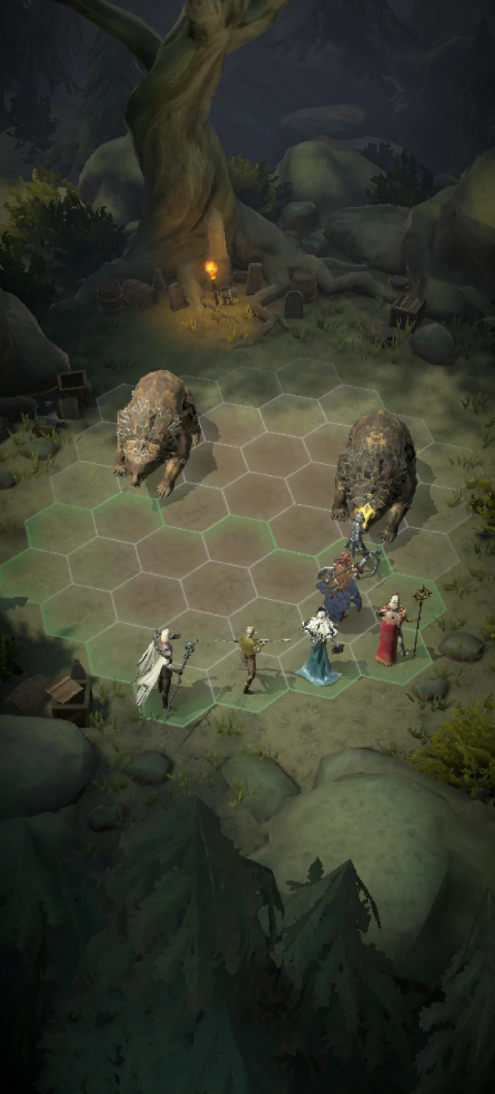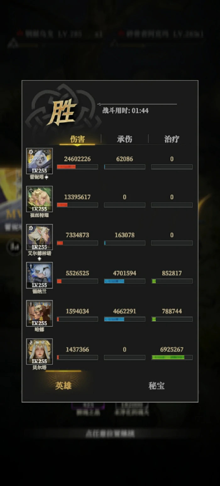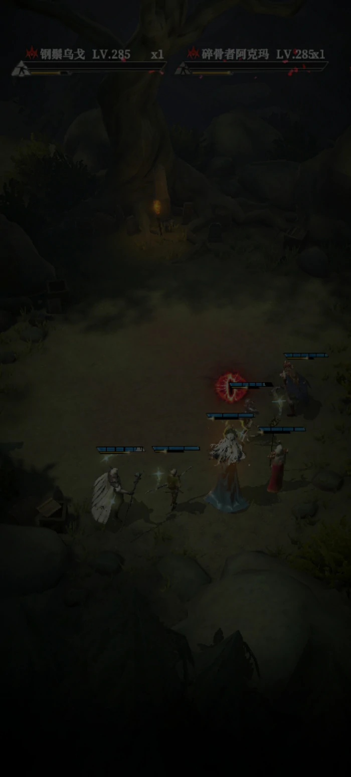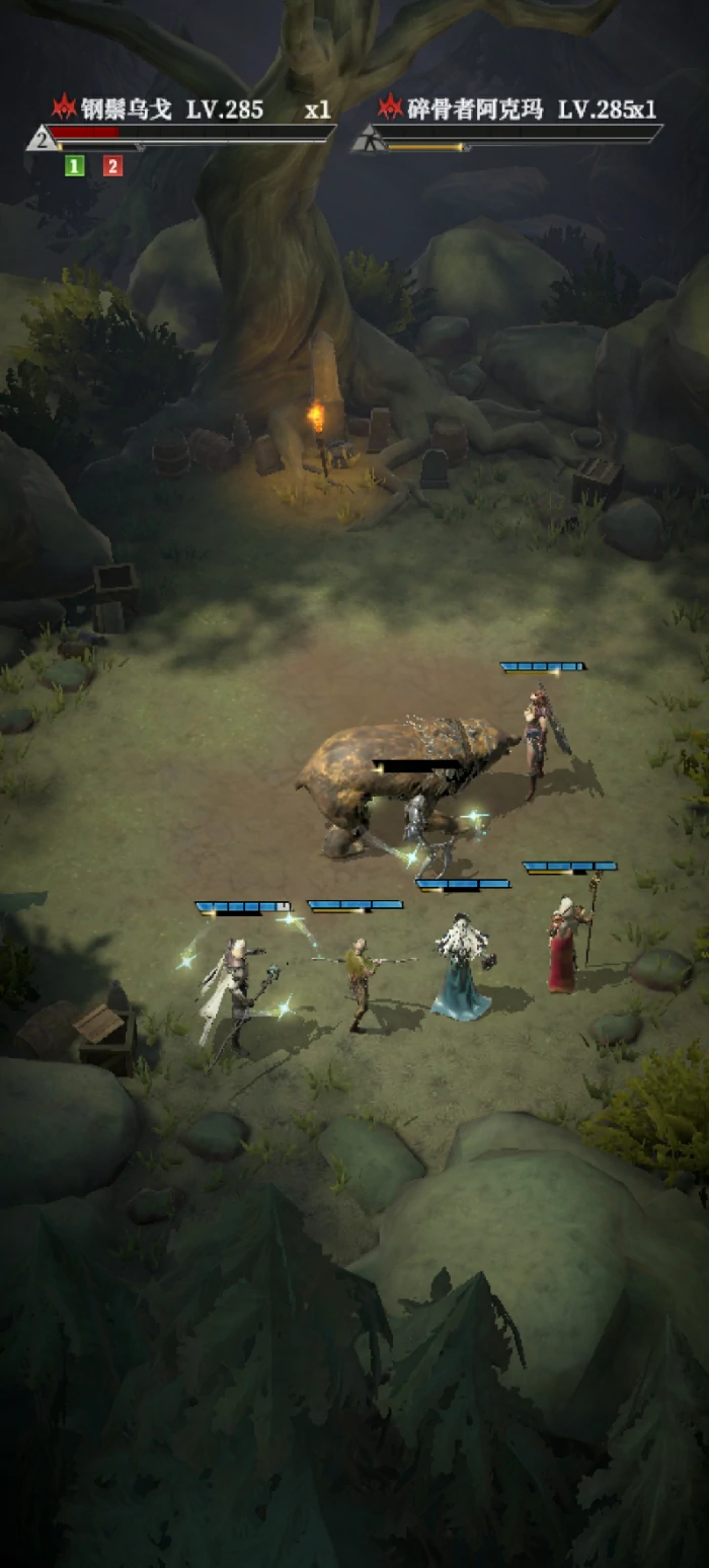 进行装备分配:寂灭配备最强装备(含律文,关键),寂灭与女蛮子穿吸血套装;绿弓用摩尔套装并携带猎魔银弩,其余三位角色穿佛洛瑞尔套装。均衡输出使两只熊血量同步下降,左侧稍快,理想状态为左熊倒下时右熊剩约一管血。