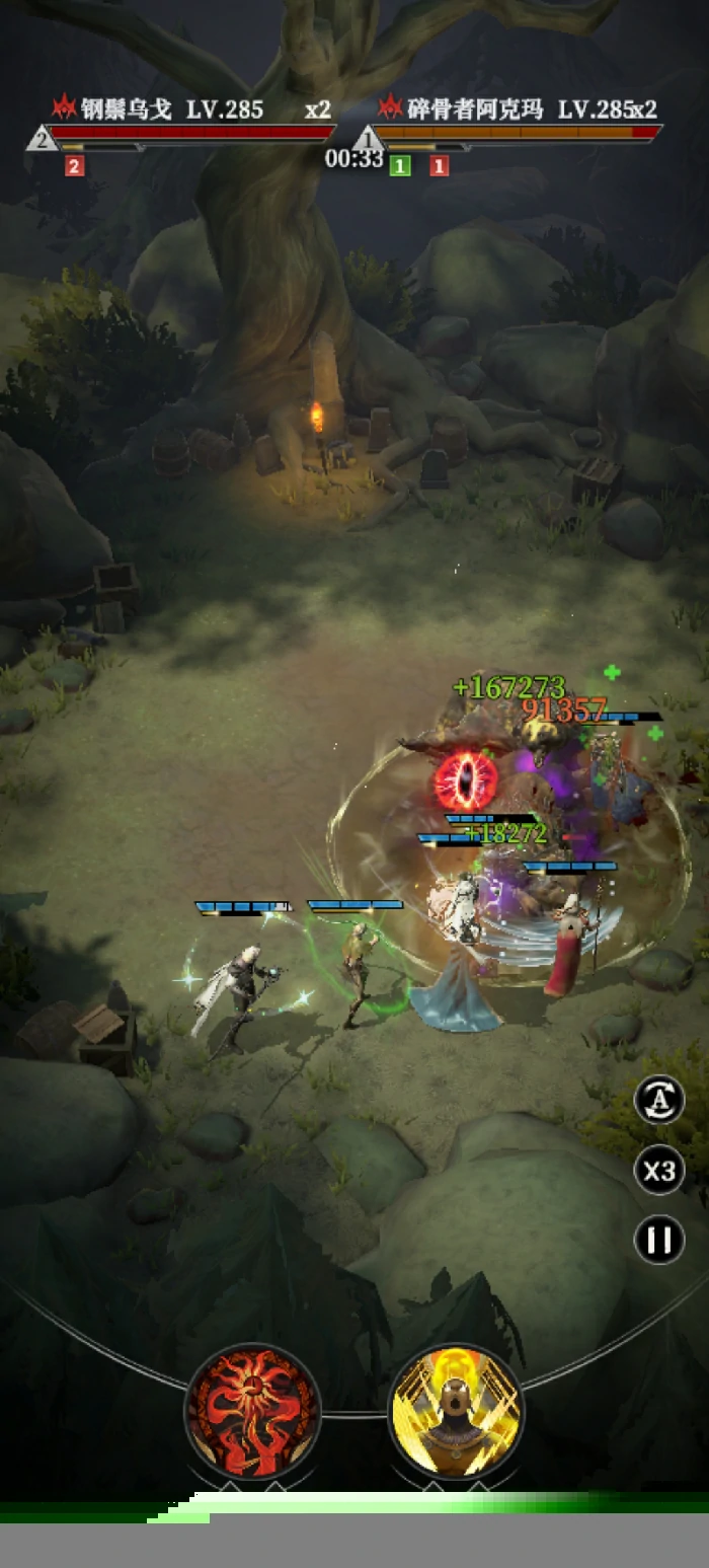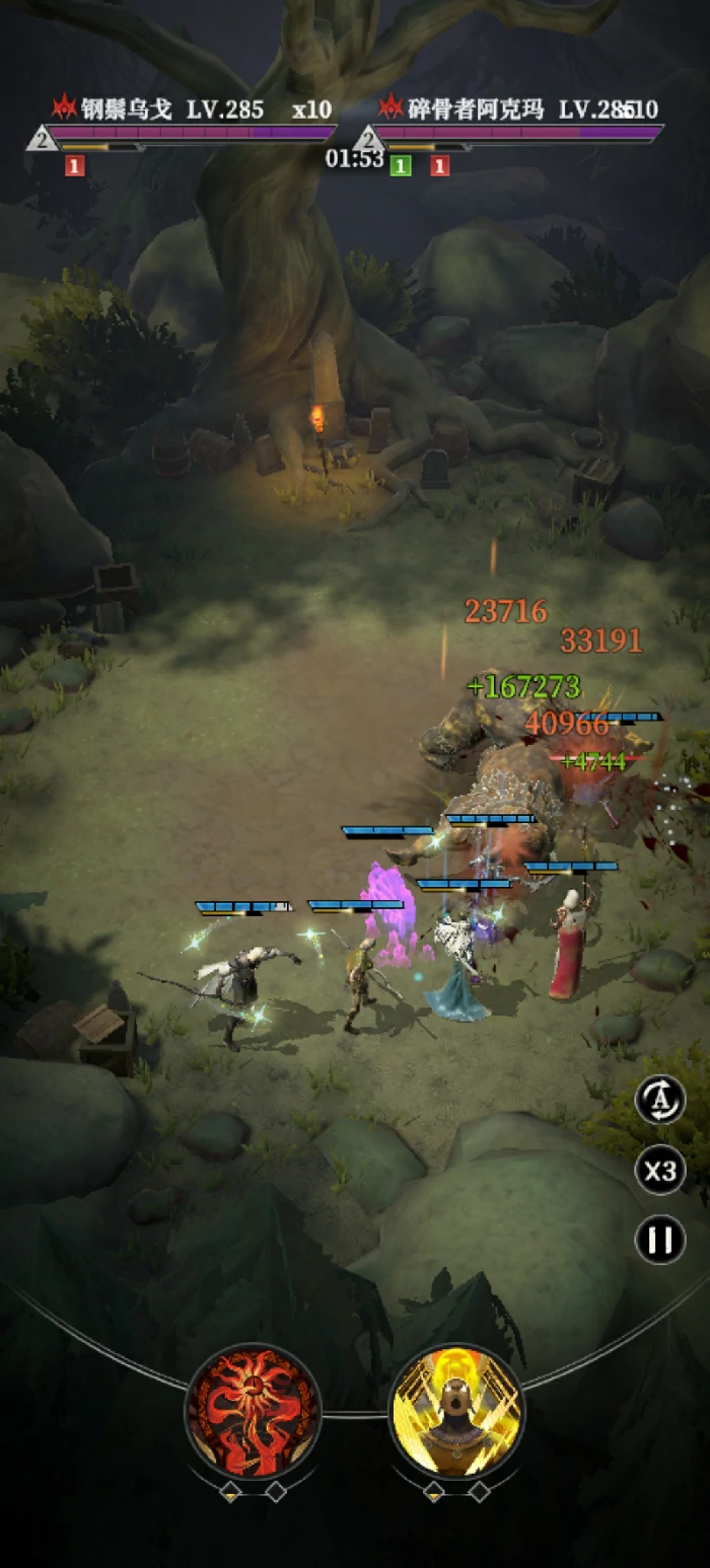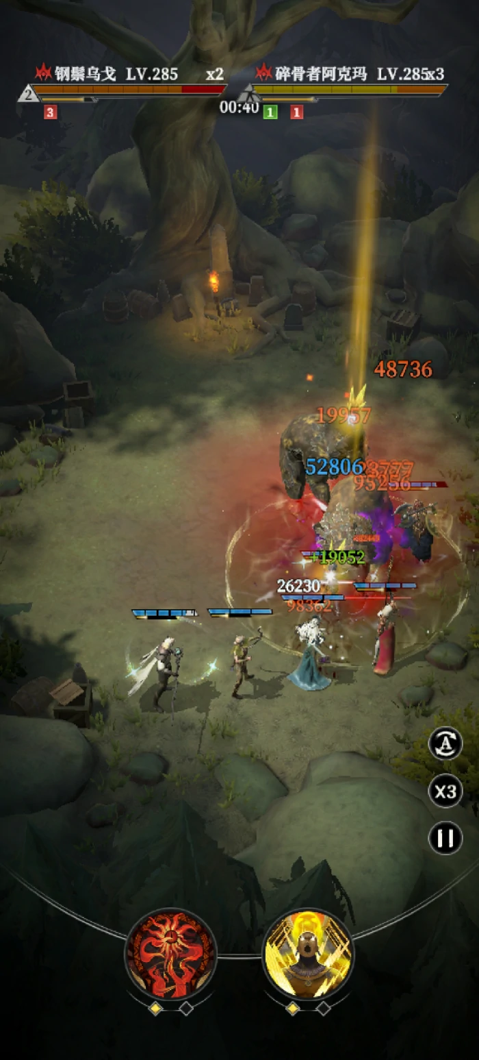 制定战术思路:必须同时攻击两只熊,集中火力先压制左熊。寂灭主攻左熊(站位关键),女蛮子攻击右熊并对两只造成范围伤害。