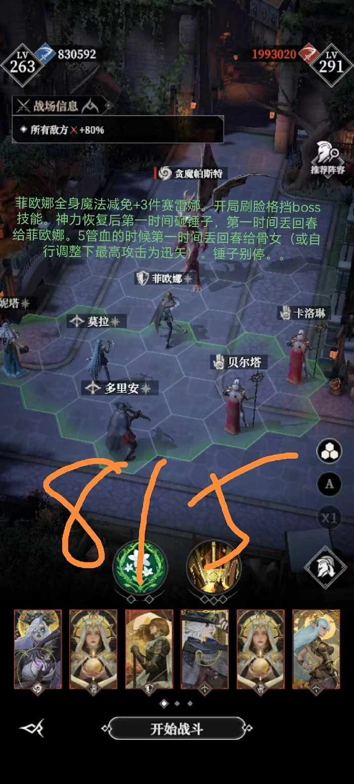 820层按推荐站位布置,可开三倍速自动战斗。左上必放光奶,BOSS技能仅锁菲欧娜。菲欧娜压力大时,调神威冷却至15秒,提高治疗频率。