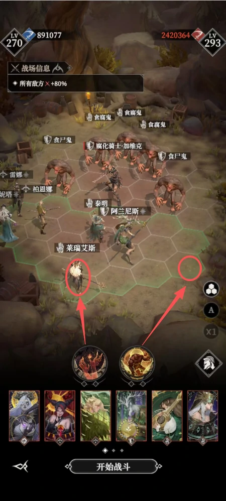执行站位操作:参考主流站位;开局释放灾厄技能至暗奶上方,填补暗奶与矮子空位;骨女出现技能图标时,右下放置石头人吸引右侧BOSS,延缓其前进;切换自动战斗,令灾厄自动触发。