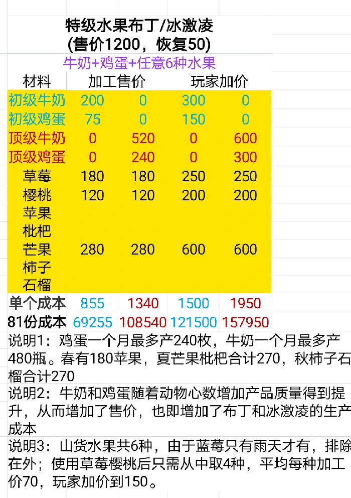 3.3 特级水果冰淇淋/布丁:受限于鸡蛋、牛奶产能和山货水果数量,成本高且产量低,是三种高级补给中性价比最低的选项。