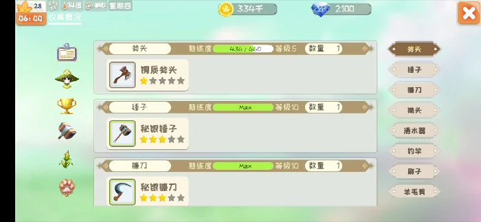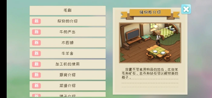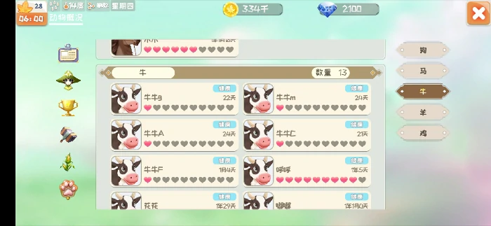 查阅家计薄,获取动物数量、材料储备、饲料余量等资源信息。点击奖杯图标,查看成就进度;点击锤子标志,显示工具状态及升级所需经验。通过动物脚印标识,检查所有动物健康状况与好感度。