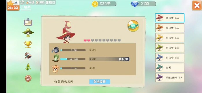 点击小精灵标志,查看小精灵状态,可培养技能、委托或取消工作安排。