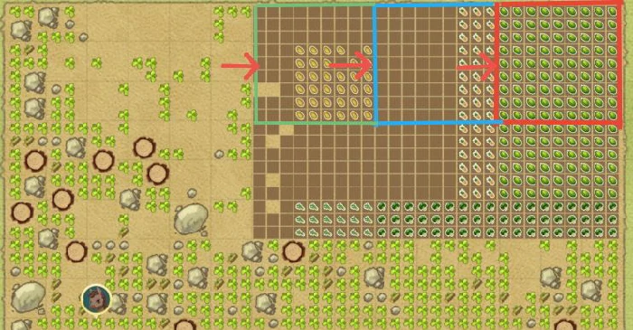 牧场土地45×30共1350格,每9格一块标准田,全场150块。秘银水壶灌溉范围81格视为一个秘银垄。