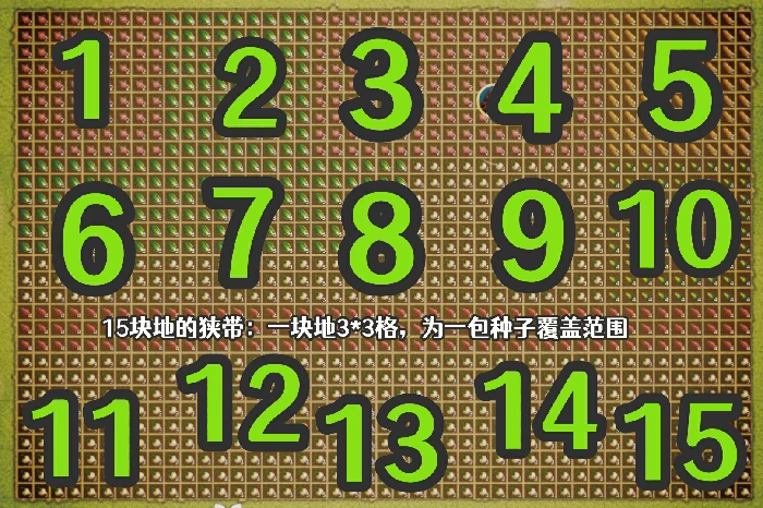 农场土地45×30格,共1350格。每包种子覆盖3×3面积为一块地,全农场可划150块地。以秘银水壶最大蓄力范围9×9格为一垄,全农场可规划15个大垄,搭配15块地组合的长条地带。布局参考下图: