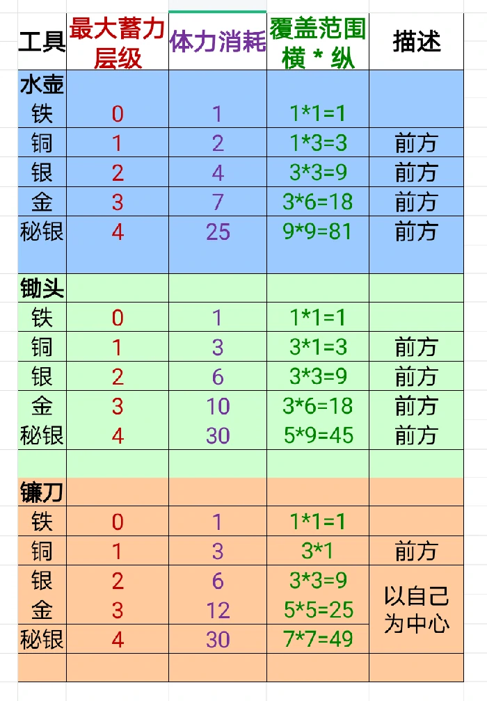 工具升级提升工作效率,每次升级加一级蓄力层次。长按操作键蓄力,蓄力层数随时间提升。水壶、锄头和镰刀具体数据如下: