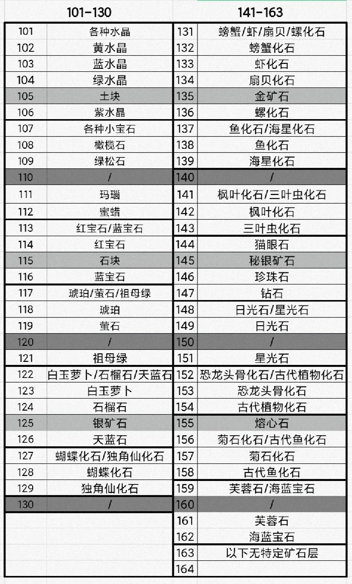 100层以上情报:特定层数刷新特定类型宝石、矿石或化石。非零结尾大层矿点数量30个;部分三星矿石层仅生成25个矿点,与其它三星矿共生则恢复30个;芙蓉石与海蓝宝石独立产出层仅20个矿点。