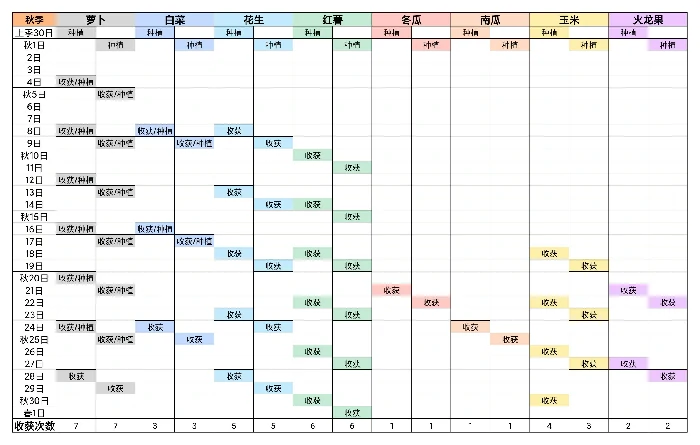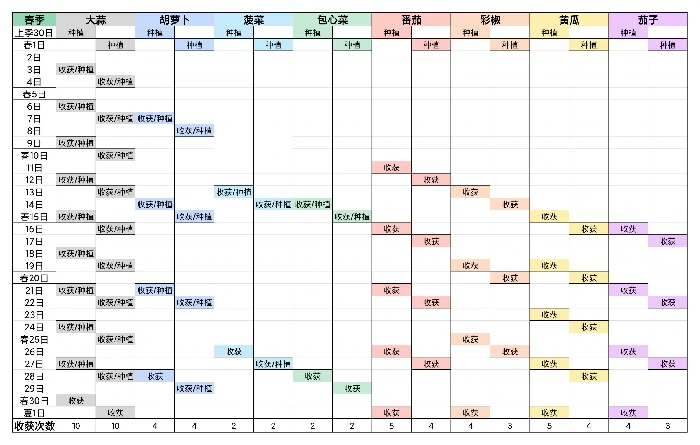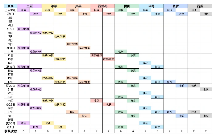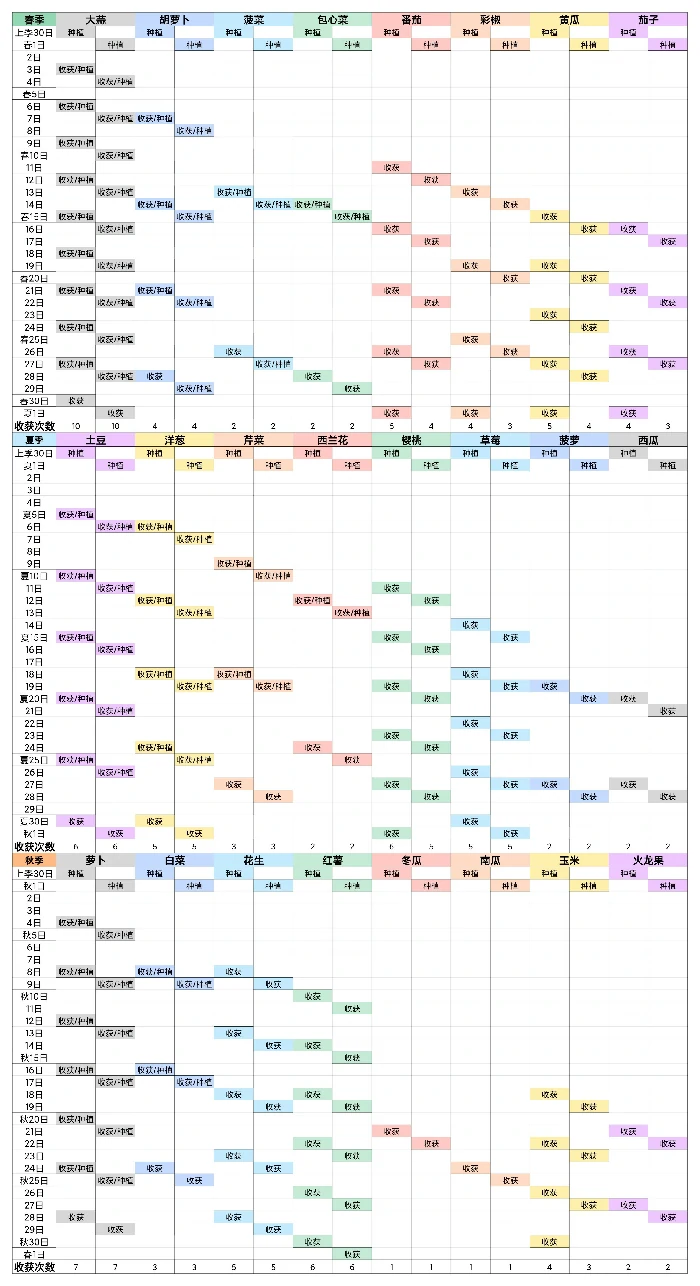 各季节作物收获次数参考数据,依据作物播种至成熟时间周期推算,呈现单季节内理论最大收获次数。实际游玩中,收获次数或受操作等因素影响,具体请以游戏内表现为准,此数据仅供参考。