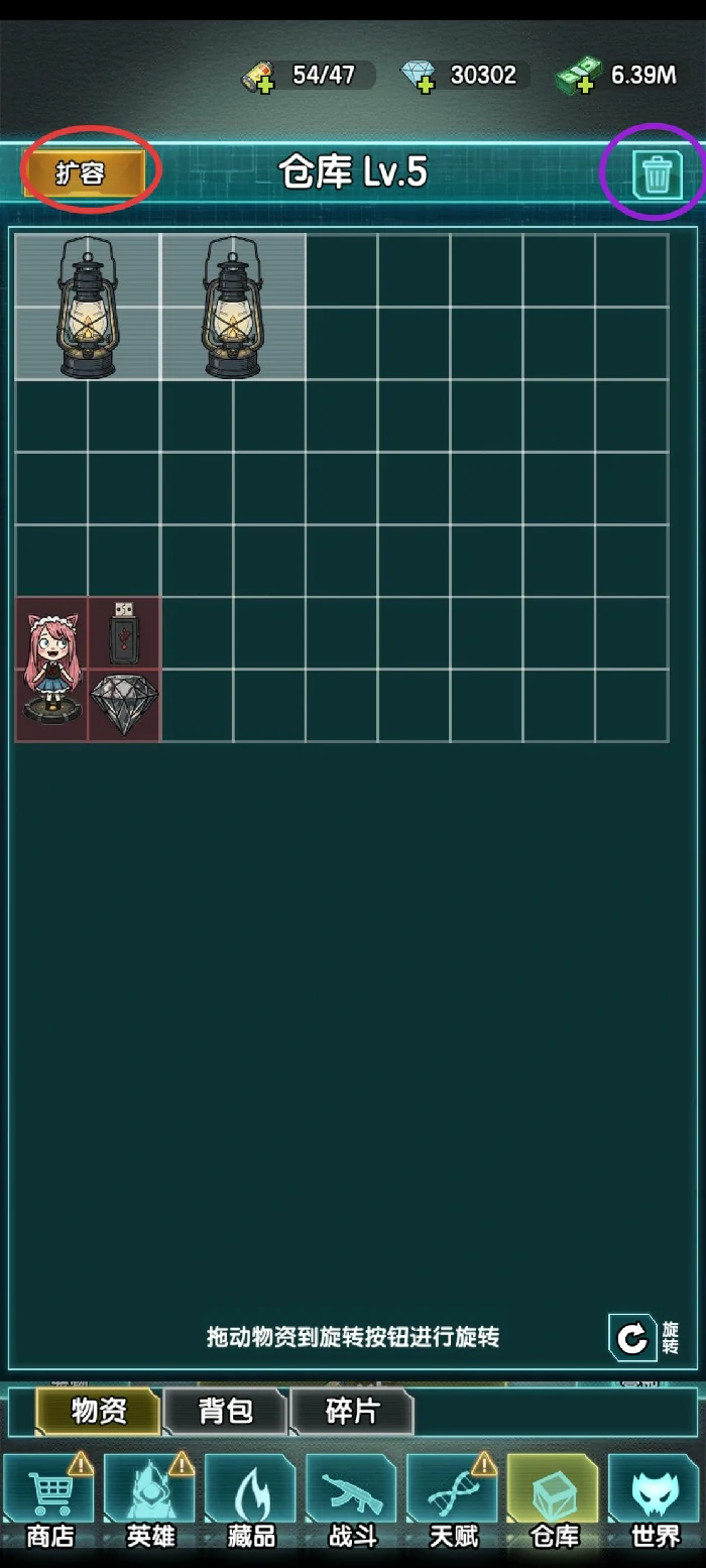紫圈垃圾桶图标,拖拽物品至此处出售;红圈仓库扩容入口,消耗特定物资及游戏货币升级。