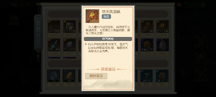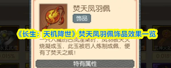 焚天凤羽佩:火系增伤饰品。入魔古凤涅槃,凤羽经天火熔炼为玉,雕琢成佩,蕴含焚天灭地威能。