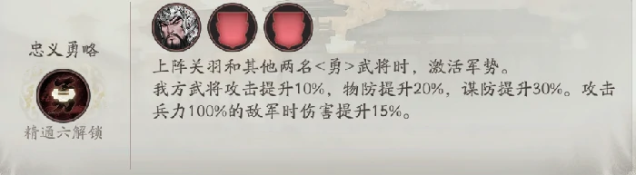 需关羽与另外两名勇属性主将同时上阵激活。三勇阵容属性单一,易被敌方克制反制,增伤仅对满血目标生效,不作优先推荐。