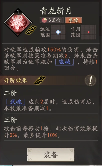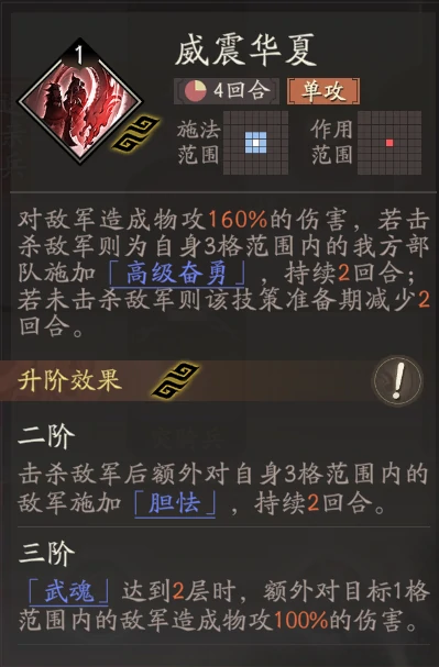 实用通用技能。前期搭配青龙斩月实现近150%倍率无冷却连招。升阶技能栏有限,即使满升迁也建议携带,确保威震华夏冷却期间仍有技能可用。