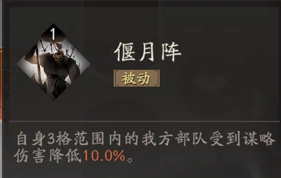 任何阶段必带被动技能,通过走位大幅提升自身属性,作用范围为自身周围九宫格。增攻效果提高斩杀线,减少误发拖刀计导致的输出下降。