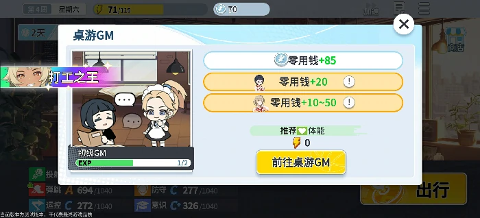 少打迷你游戏!先看扭蛋机,有训练等级道具直接买;没有就打工赚金币,换全能饮料(全属性+)。扭蛋出金色单属性+400道具,必拿下!等于四次海滩表情加倍修炼。