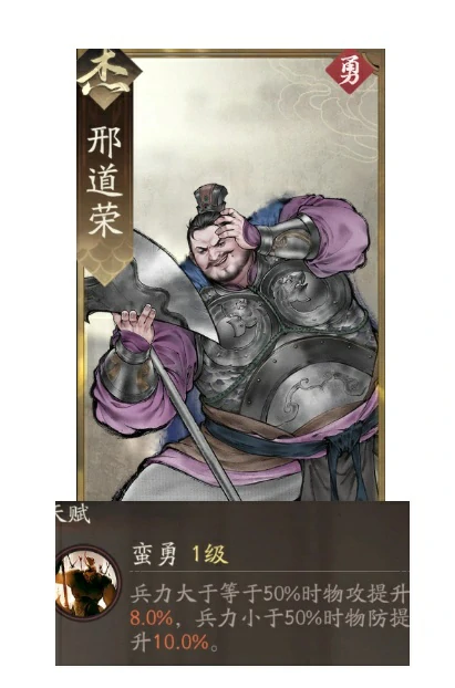 邢道荣:属性全面,技能实用,性价比极高的副将。