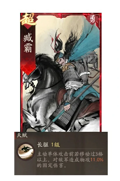 臧霸是专属优选:用长驱提前激活新月寒芒增伤,弥补斩杀线不足;配合流星赶月触发封技,打高防御目标超给力。