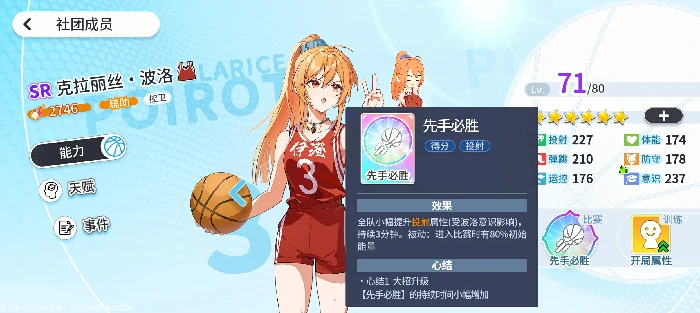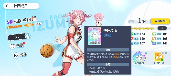 第三位和泉,技能为我方得分最高球员回复大招能量,适配单核或双核打法,培养侧重意识、防守和体能。