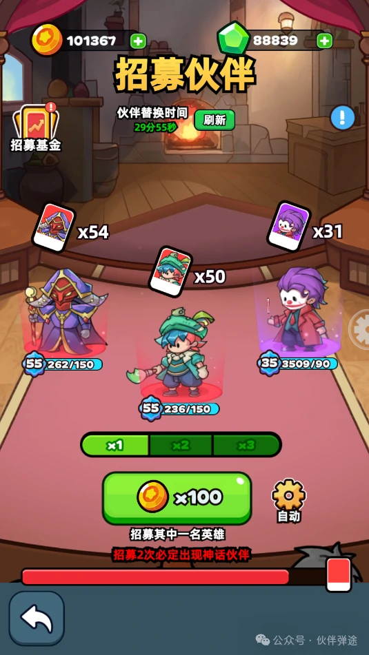 酒馆招募策略:1. 留292绿钻+100金币,首抽拿神话伙伴(哪吒/敖丙),强输出早到手。2. 蓝及以下伙伴不投资源,后期材料够升35级补属性伤,别用升星石。3. 开三倍抽取后,红色保底刷2高品质(神话/传说)再抽,非保底不花钻。4. 两神话保底约5000金币,期间刷到神话可1倍抽。