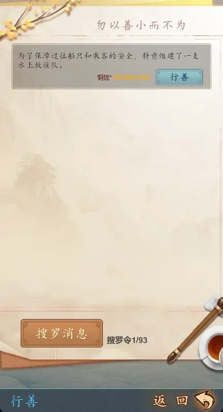 家族崛起初期,快速积累声望必用行善玩法。启动搜罗令,主动发现民间事件,选择是否介入。每次抉择影响剧情走向,触发随机回报或风险,考验人性与策略把控能力。