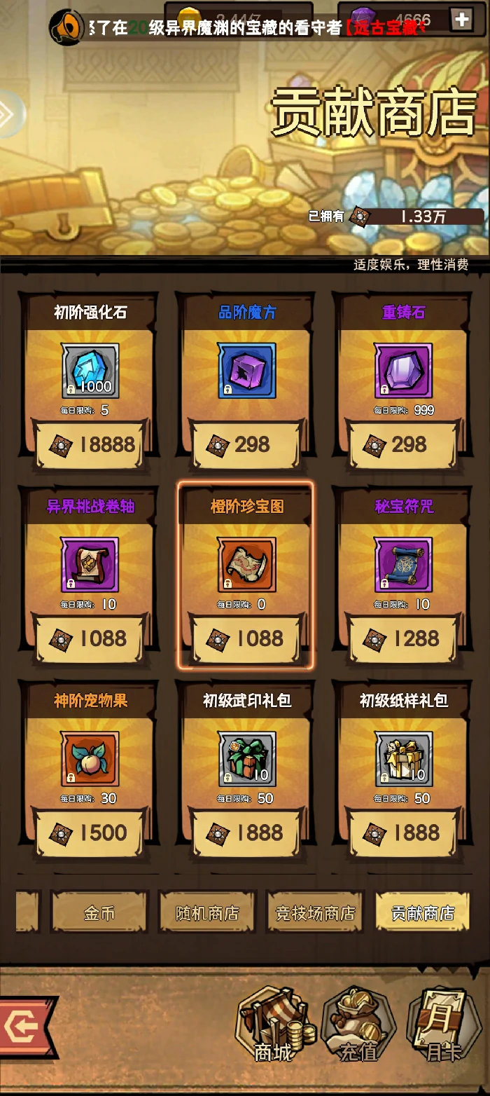 金币商店每日宠物果、强化石、普通寒铁、异界挑战券买满。