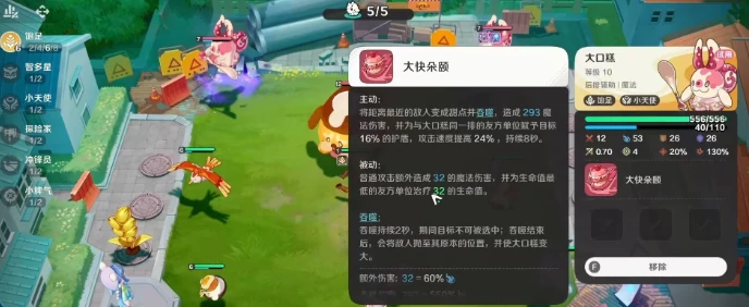 被动:普攻附加魔法伤害,同时治疗己方血最低单位,治疗量等于该次伤害值。被吞敌人2秒不可选中,返回后大口糕体型变大。